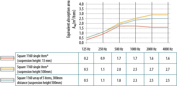 De lydabsorberende egenskapene til flåter og bafler blir kvantifisert ved bruk av ekvivalent lydabsorpsjonsareal Aeq uttrykt som m² per objekt. Verdien Aeq måles i overensstemmelse med ISO 354. Dette er arealet til en fiktiv absorberende overflate på αw = 1,00 som absorberer samme mengde lyd som den testede baffelen eller flåten. Det finnes ikke noe standardisert "vektet" ekvivalent lydabsorpsjonsareal, så den beste løsningen for å sammenligne en plan himling med en himling med flåter eller bafler, er å sammenligne etterklangtiden for hvert rom og for hver situasjon.